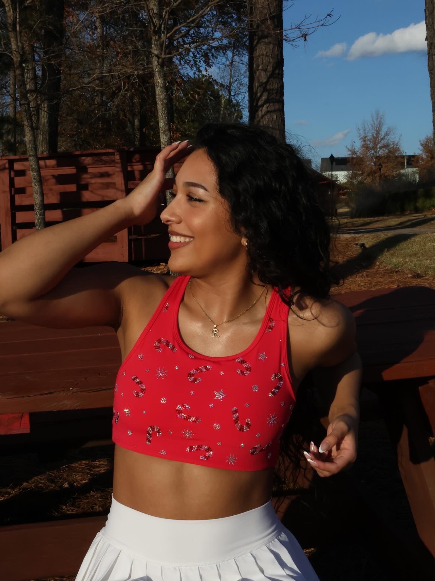 treat your sweet tooth with stunning RR5000 designed retail sports bras. this seasonal red bra with white mesh back bra is featured with beautiful candy cane accents with red stones and our signature RR ab crystal.